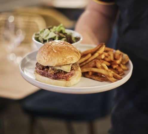 Pain artisanal de chez Dim & Helo, saint nectaire fermier, ognons confit, sauce au poivre vert & steak de canard des Canards de François